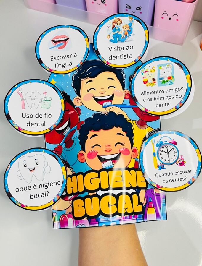 Apresento a Luva Pedagógica: Higiene Bucal — um recurso criativo que estimula a participação das crianças e facilita o aprendizado sobre os cuidados com os dentes de maneira leve e interativa.